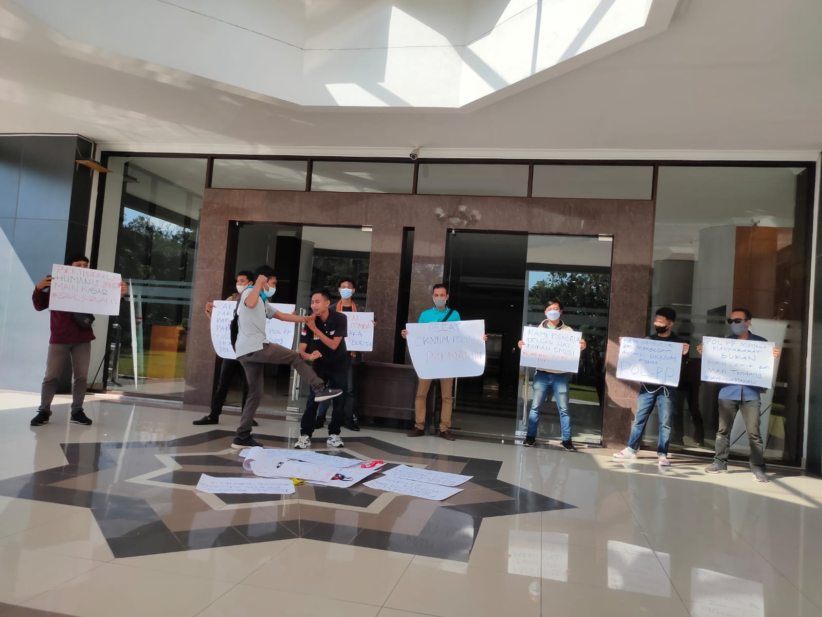Dengan membawa selebaran dan pamflet, belasan insan pers Lotim melakukan aksi teatrikal dan berorasi. Mereka meminta agar pemerintah Daerah Lotim dan Satpol PP bertindak tegas terhadap oknum yang menganiaya wartawan Inside Lombok, Deni Zarwandi belum lama ini.
