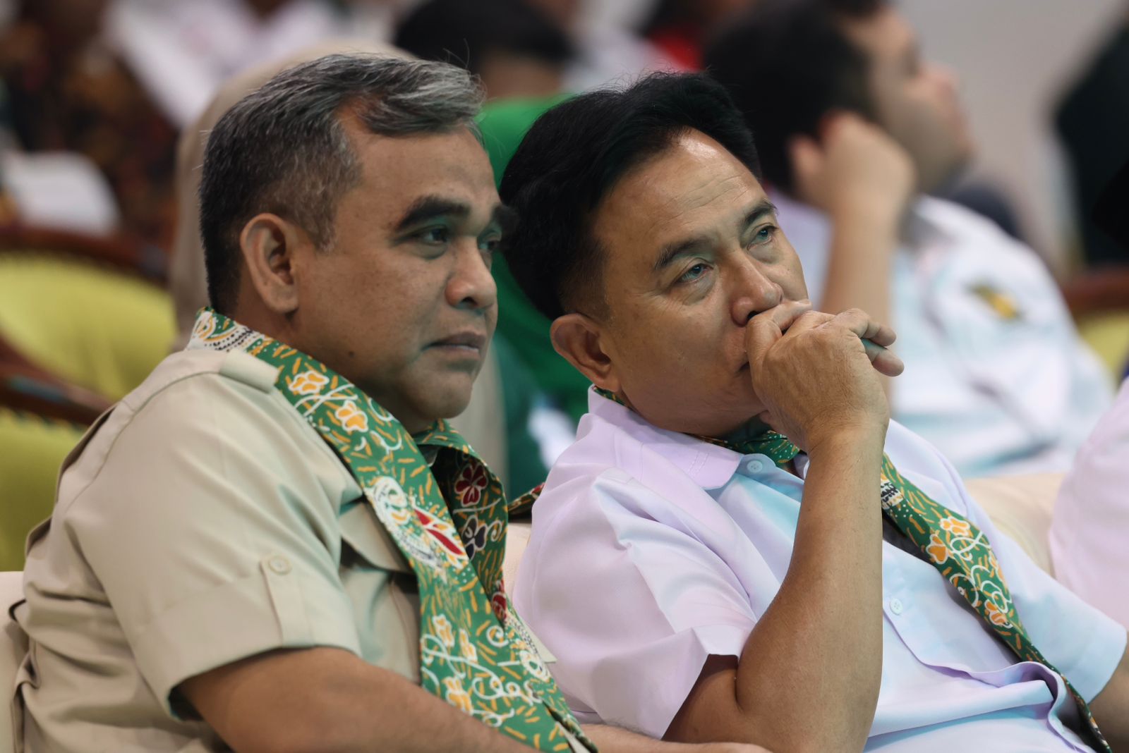 Sekjen Partai Gerindra Ahmad Muzani menghadiri konsolidasi serta deklarasi dukungan dari Partai Bulan Bintang (PBB) kepada Prabowo Subianto di DBL Arena, Surabaya, Jawa Timur, Minggu (3/9). Ribuan kader PBB dan Gerindra terlihat memadati tribun dan teriakan Prabowo presiden menggema.