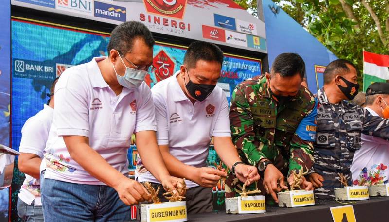 Sebanyak 750 terumbu karang ditanam di pesisir Pantai Senggigi, Lombok Barat, Sabtu (3/10). Kegiatan yang dilakukan Gubernur, Kapolda NTB dan Danrem 162/WB ini dilaksanakan dalam rangka Hari Ulang Tahun (HUT) ke-75 TNI yang jatuh pada tanggal 5 Oktober mendatang. “Jika terumbu karang rusak atau terganggu kondisinya, maka semua rantai makanan dan siklus kehidupan biota laut akan terganggu. Bahkan berpotensi menuju kepunahan. Di sini pentingnya upaya program pengelolaan terumbu karang,” ujar Gubernur NTB, Dr. H. Zulkieflimansyah usai menanam terumbu karang.