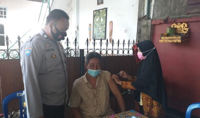 Mataram – Bhabinkamtibmas Kelurahan Monjok Timur Aiptu Dewa Putu Suara Yasa melaksanakan kegiatan pengamanan sekaligus monitoring kegiatan penyuntikan Vaksin Covid-19 kepada Lansia atau orang yang berusia 60 tahun ke atas di Lingkungan Gubuk Kelurahan Monjok Timur Kecamatan Selaparang Kota Mataram, Kamis (04/03/2021).