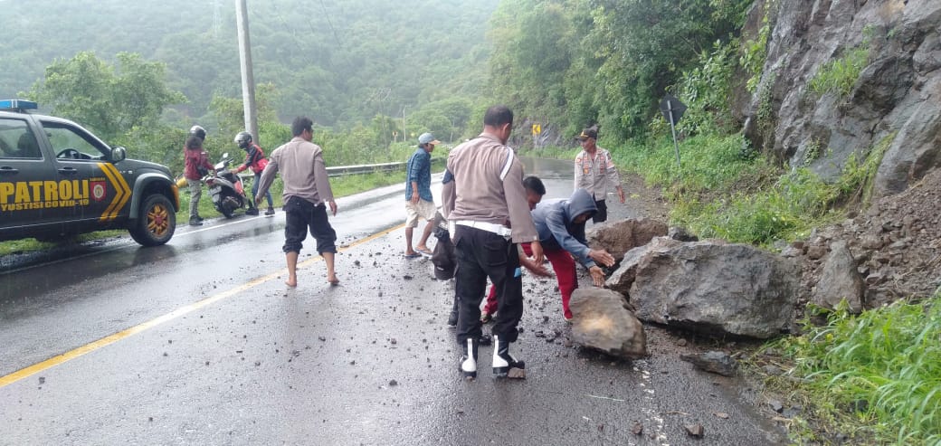 Sore sekitar pukul 16.30 wita pasca turun hujan, personel Polsek Manggelewa melaksanakan patroli ke sepanjang jalan nanga tumpu. Guna melakukan pengecekan di lokasi rawan tanah longsor, alhasil ditemukan bebatuan dan tanah dari atas bukit akibat tanah longsor kembali menutupi ruas jalan di beberapa titik sepanjang jalan tanjakan nanga tumpu. Anggota Polsek Manggelewa, kembali mengangkat batu dan membersihkan tanah yang berada di ruas jalan.