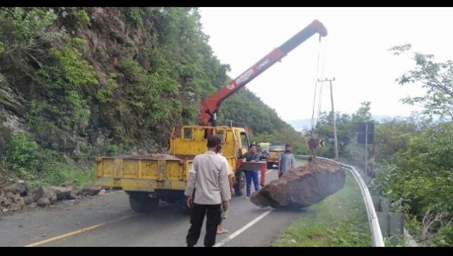 “ini saja sejumlah bebatuan berserakan di pinggir maupun di atas aspal. Bahkan satu buah bongkahan batu besar terpaksa disingkirkan menggunakan mobil khusus dari Dinas Pekerjaan Umum dan Perumahan Rakyat (PUPR) Kabupaten Dompu, “kata Kapolsek Manggelewa.
