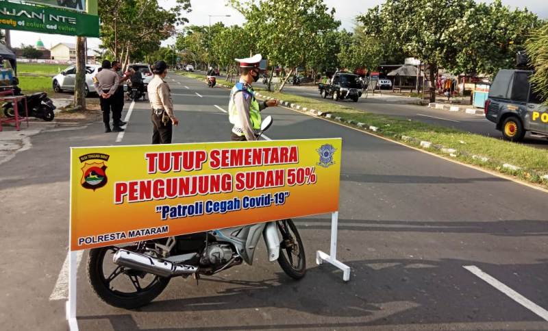 Jumlah pengunjung yang datang ke lokasi wisata dibatasi polisi. Ini terlihat salah satunya di Pantai Mapak, Ampenan, Kota Mataram yang padat dikunjungi wisatawan, pada Minggu (4/10/2020) pagi. Kehadiran mereka untuk menikmati dan melepas penat dengan datang ke lokasi wisata. Tidak ingin terjadi penumpukan di lokasi wisata, Polsek Ampenan menutup akses untuk membatasi pengunjung. Petugas menutup akses masuk ke Pantai Mapak karena pengunjung yang datang sudah mencapai 50 persen. “Kita batasi pengunjung yang datang. Karena pengunjungnya sudah 50 persen. Kita tidak izinkan lagi pengunjung datang,” ungkap Kapolsek Ampenan, AKP Raditya Suharta, Minggu (4/10/2020).