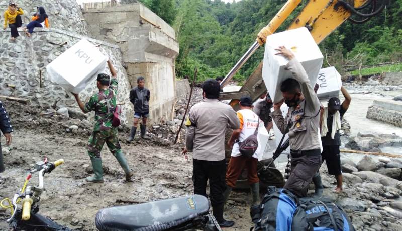 Jembatan putus di salah satu sungai menuju Kecamatan Orong Telu sempat menghambat penditribusian. Namun, petugas tidak kehabisan akal untuk melewatinya. Seperti yang dilakukan Bhabinkamtibmas Desa Senawang, Kecamatan Orong Telu, Bripka Efendi. Bhabinkamtibmas ini melakukan hal yang tidak biasa.