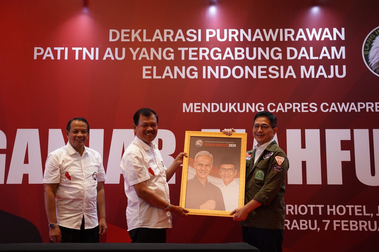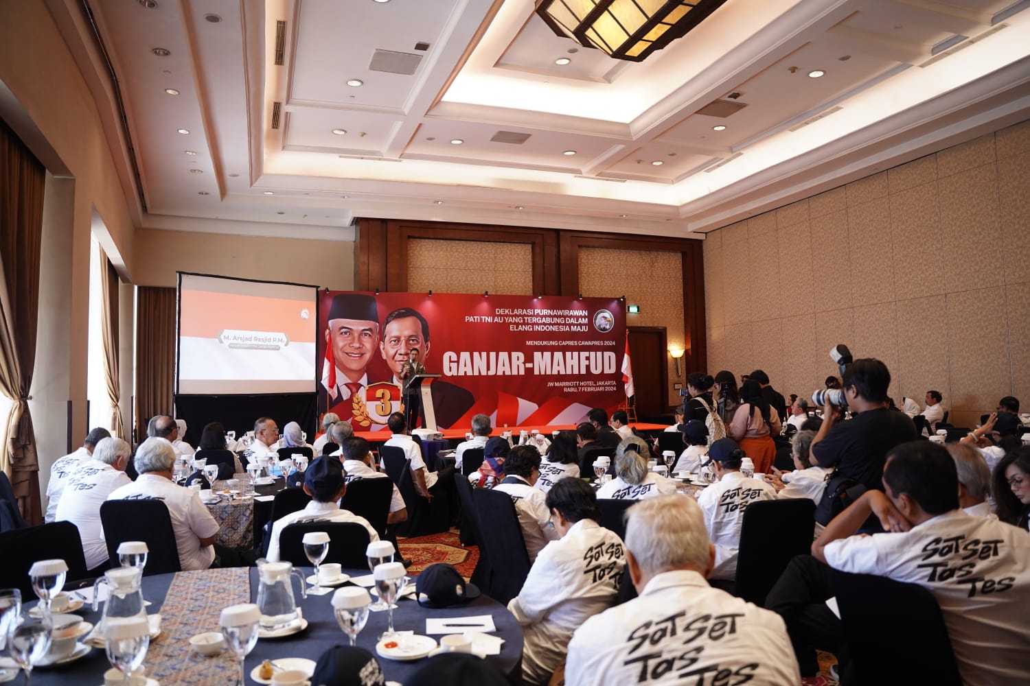 Jakarta – Sejumlah purnawirawan perwira tinggi Tentara Nasional Indonesia Angkatan Udara (TNI-AU) mendeklarasikan dukungan kepada pasangan presiden – wakil presiden Ganjar Pranowo dan Mahfud MD. Para purnawirawan yang tergabung dalam organisasi “Elang Indonesia Maju untuk Ganjar-Mahfud” mendeklarasikan dukungan tersebut di Hotel JW Marriott, Jakarta, pada Rabu, 7 Februari 2024.