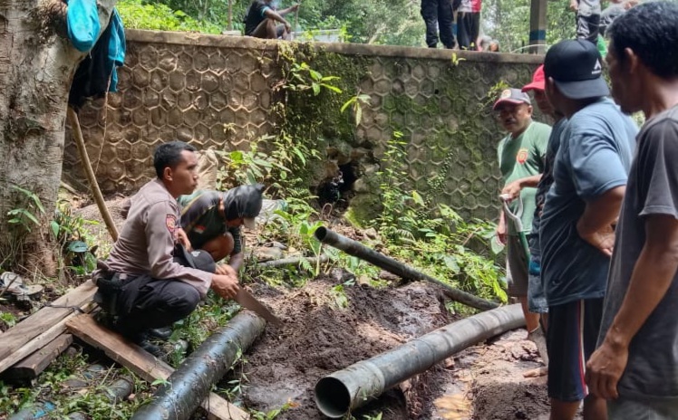 Kapolsek Pekat Ipda Muh. Sofyan S.Sos bersama seluruh personelnya berupaya untuk menormalisasi air bersih warga dengan memperbaiki kerusakan pipa air.