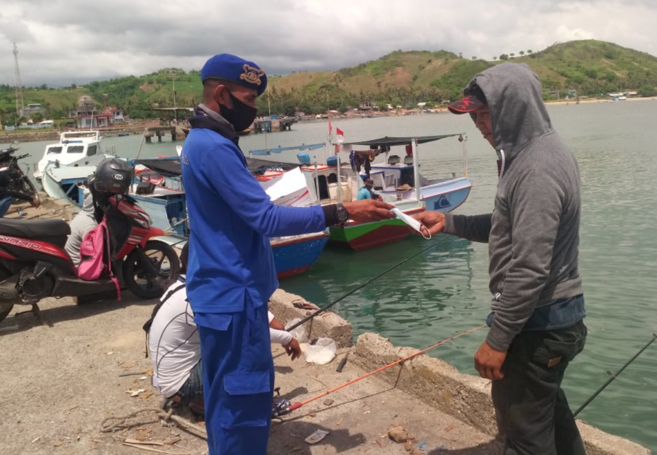 Satuan Polair Polres Lombok Tengah membagikan masker kepada nelayan dan masyarakat dikawasan pesisir teluk Awang Desa Mertak Kecamatan Pujut, Lombok Tengah. Minggu (10/1/21).