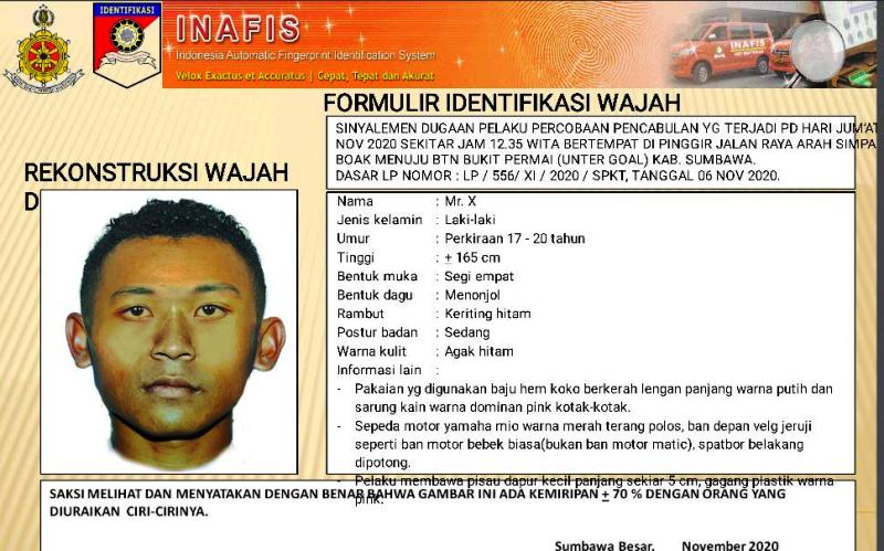 Untuk mengungkap identitas pelaku, polisi pun sudah membuat sketsa wajah. Ini berdasarkan ciri-ciri fisik yang disebutkan korban. Hal ini diakui Kapolres Sumbawa yang dikonfirmasi melalui Kasat Reskrim, IPTU Akmal Novian Reza SIK, Selasa (10/11/2020).