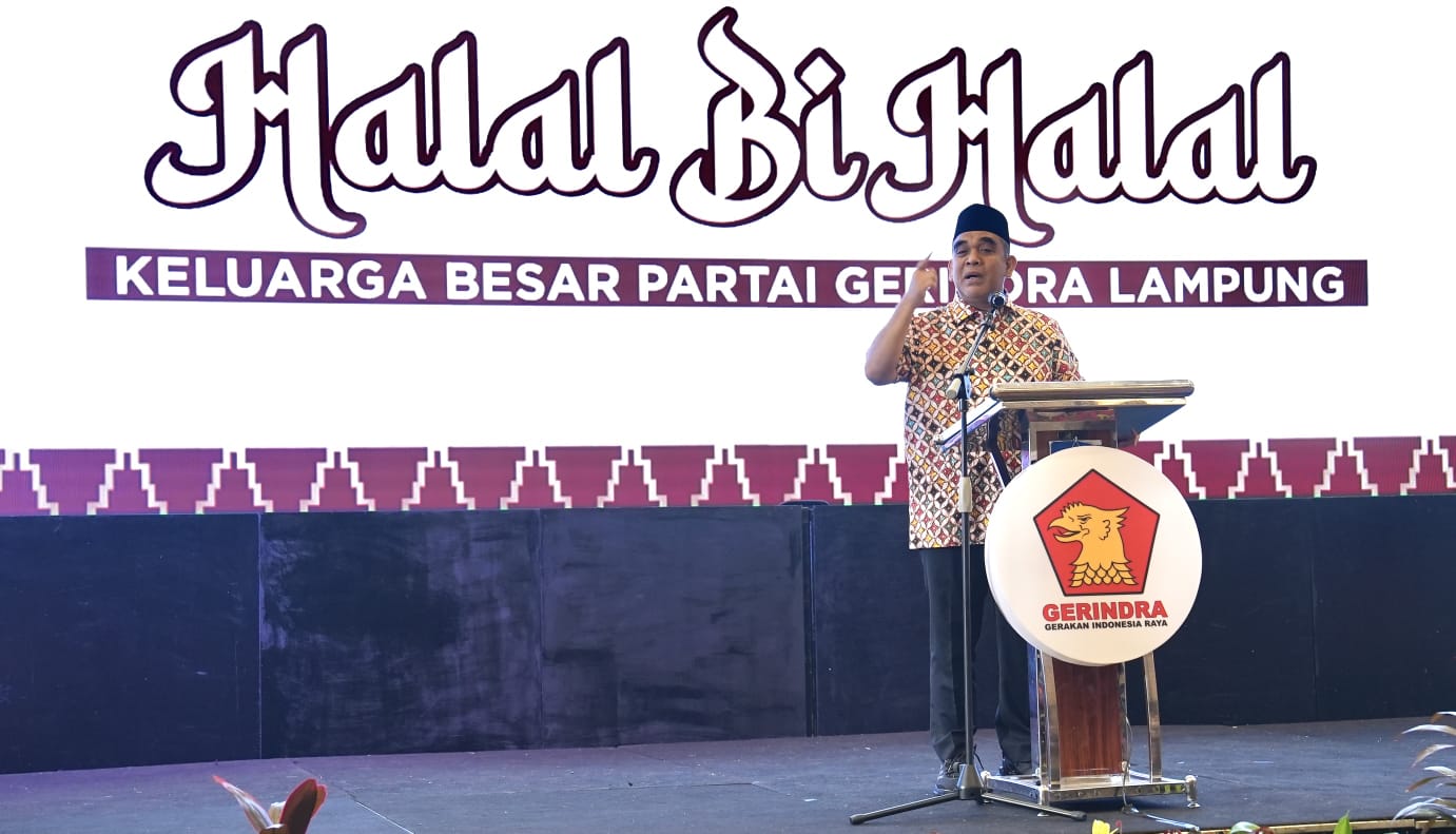 Sekjen Gerindra Ahmad Muzani menghadiri halal bi halal seluruh pengurus Gerindra Lampung pada Sabtu (11/5). Pada kesempatan ini Muzani memperkenalkan calon gubernur Lampung yang sudah diputuskan oleh Ketua Umum Partai Gerindra Prabowo Subianto, yakni Rahmat Mirzani Djausal.