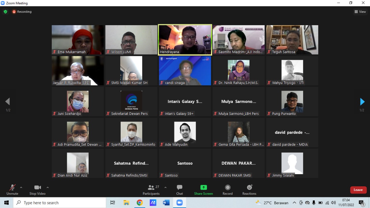 JAKARTA – Dewan Pers dan konstituennya, termasuk Serikat Media Siber Indonesia (SMSI), Senin malam (11/7/2022) bersama-sama mengkritisi Rancangan Kitab Undang-Undang Hukum Pidana (KUHP) melalui aplikasi zoom yang dikendalikan dari Jakarta.