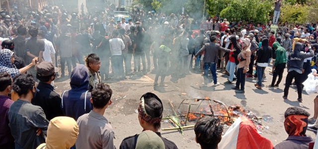 Mahasiswa Dompu yang menamakan diri Kesatuan Masyarakat Dompu (KMD) kembali menggelar aksi unjukrasa menolak pengesahan undang-undang cipta kerja  di gedung DPRD Dompu, Senin (12/10/2020). Dalam aksinya massa membakar ban dan membakar keranda mayat.