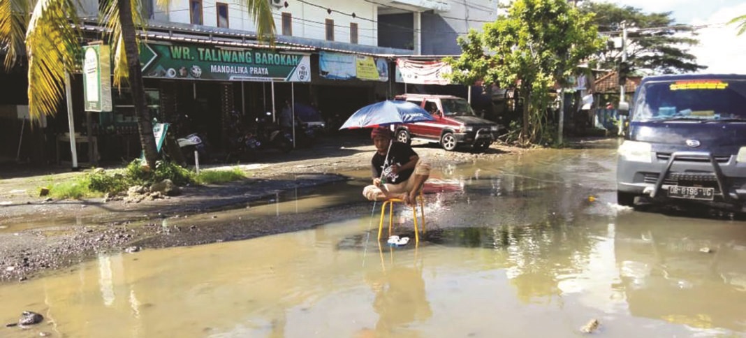 PRAYA – Johan Hadi, warga Tengari, Kecamatan Praya, Lombok Tengah, menjadi pusat perhatian pengguna jalan, Selasa (16/3/2021) lalu. Dia mandi dan memancing ikan di kubangan air di jalan berlubang yang berlokasi di perempatan kampus IPDN. Aksi itu dilakukan sebagai protes kepada Pemprov NTB karena jalan yang sudah lama rusak parah tak kunjung diperbaiki.