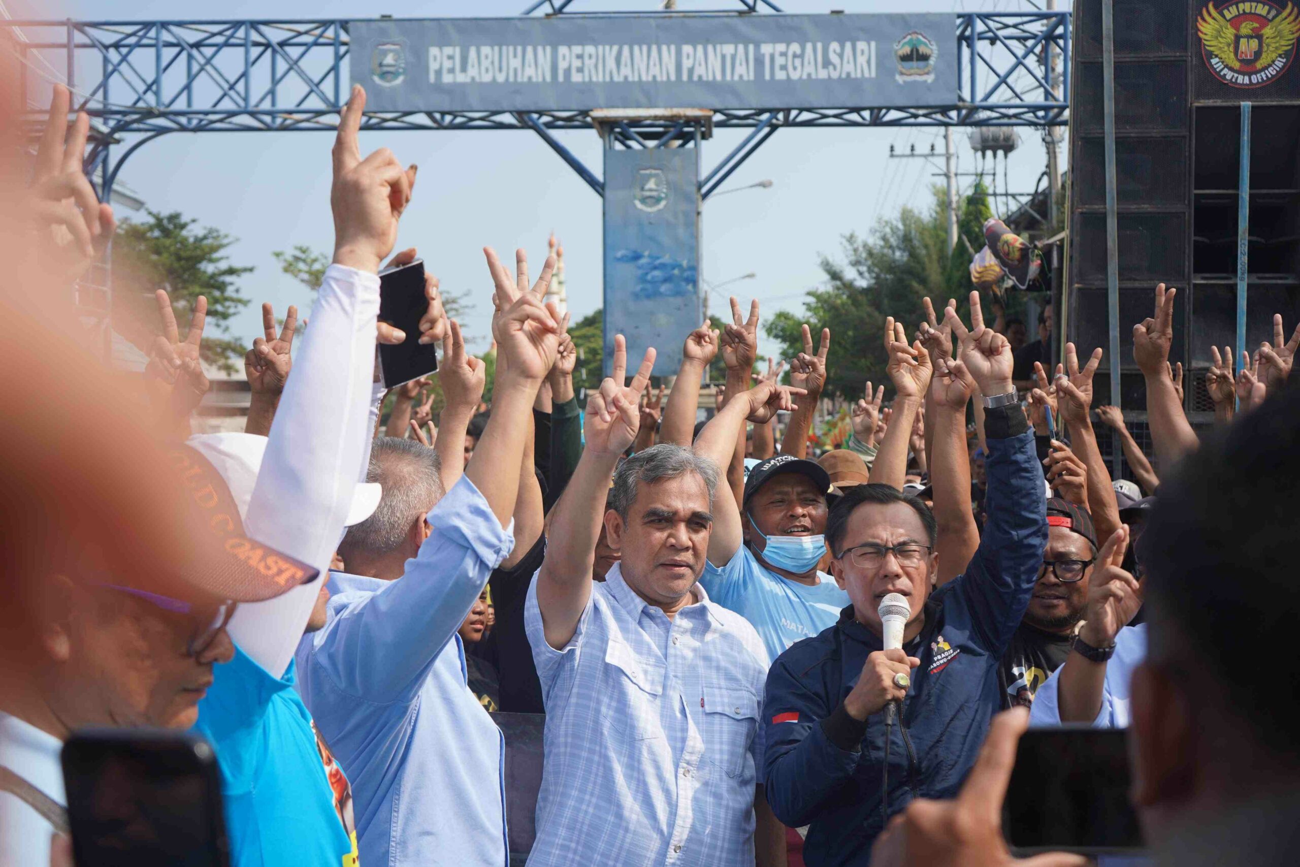 TEGAL— Sekjen Partai Gerindra sekaligus Wakil Ketua Tim Kampanye Nasional, Ahmad Muzani, menghadiri deklarasi dukungan Solidaritas Nelayan Indonesia (SNI) kepada pasangan capres cawapres nomor urut 2, Prabowo-Gibran. Deklarasi dihadiri ribuan nelayan dan masyakarat di Pelabuhan Perikanan Pantai Tegalsari, Kota Tegal, Minggu (17/12).