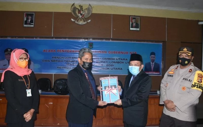 Mataram – Gubernur Nusa Tenggara Barat Dr Zulkieflimansyah diwakili Asisten Pemerintahan dan Kesra Setda NTB Hj Baiq Eva Nurcahya Ningsih menyerahkan Surat Perintah Tugas (SPT) Pelaksana Harian (Plh) Bupati Lombok Utara kepada Penjabat Sekda H Raden Nurjati dirangkaikan dengan serah terima jabatan Bupati Lombok Utara masa jabatan 2016-2021 kepada Plh Bupati Lombok Utara (17/2/2021).