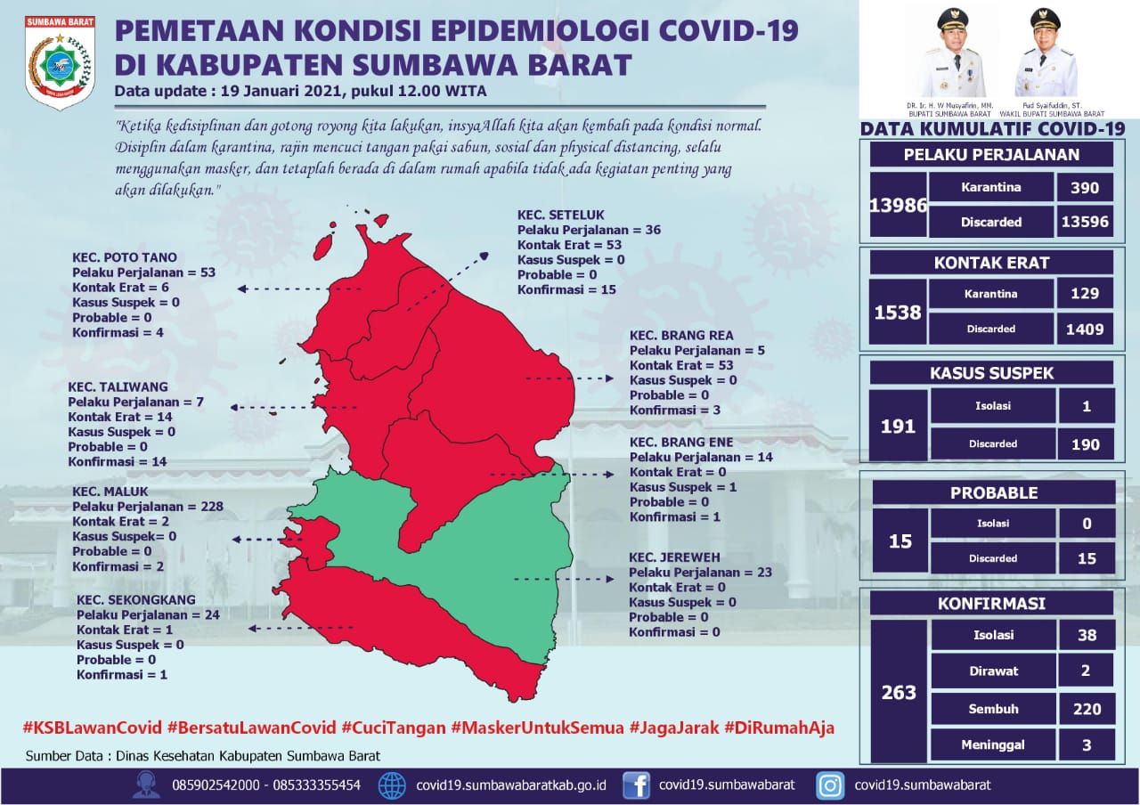 Adapun data hingga tanggal 20 Januari 2021 berdasarkan pres release satuan tugas Covid-19 KSB dilaporkan, ada 1 lagi tambahan Positif dari Kecamatan Seteluk, dengan demikian jumlah Konfirmasi Covid-19 di Kabupaten Sumbawa Barat sebanyak 264 dengan rincian 220 orang telah sembuh, 41 orang positif dan 3 orang meninggal.