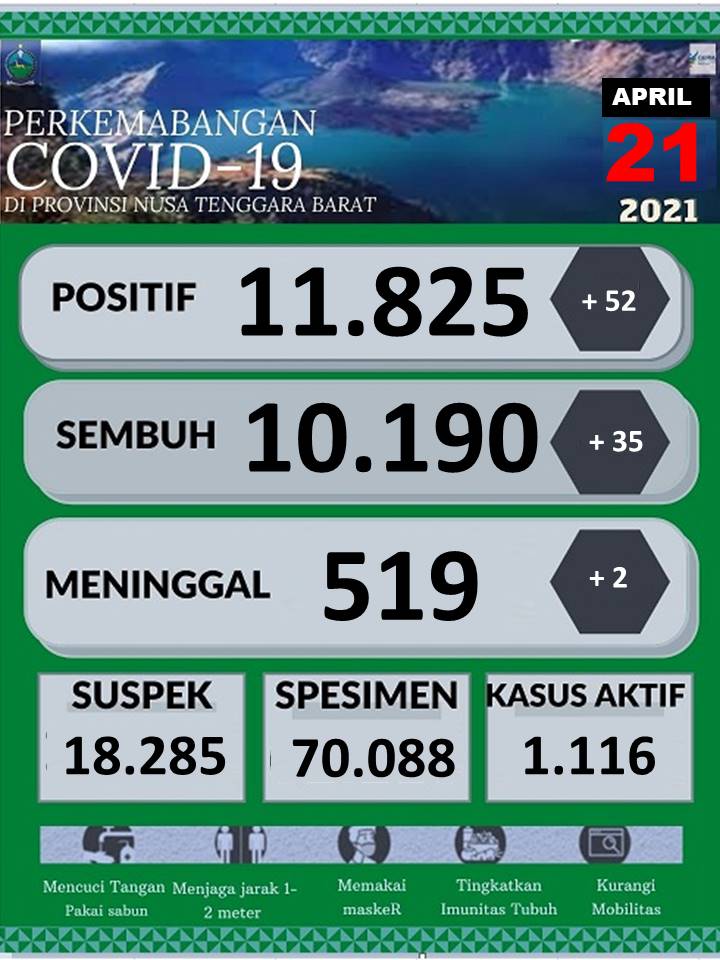 “Dengan adanya tambahan 52 kasus baru terkonfirmasi positif Covid-19, 35 tambahan sembuh baru, dan 2 kasus kematian baru, maka jumlah pasien positif Covid-19 di Provinsi NTB sampai hari ini (21/04) sebanyak 11.825 orang, dengan perincian 10.190 orang sudah sembuh, 519 meninggal dunia, serta 1.116 orang masih positif,” terang Lalu Gita Ariadi yang juga Sekda NTB itu.
