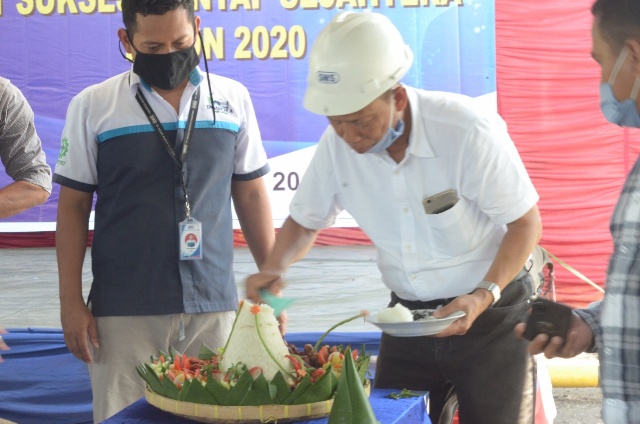GM PT SMS Djoko Waluyo memotong tumpeng pada acara syukuran tutup giling Tebu tahun 2020.