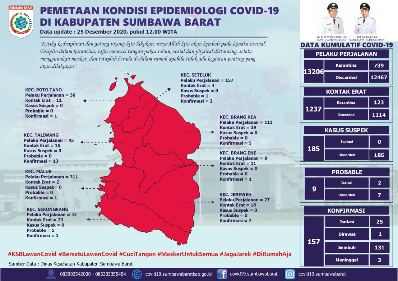 Sumbawa Barat, KMCNews – Kabupaten Sumbawa Barat kini seratus persen Zona merah penyebaran Covid-19, berdasarkan Press Release Satgas Penanganan Covid-19, Jum’at 25 Desember 2020 ada 4 tambahan positif baru.