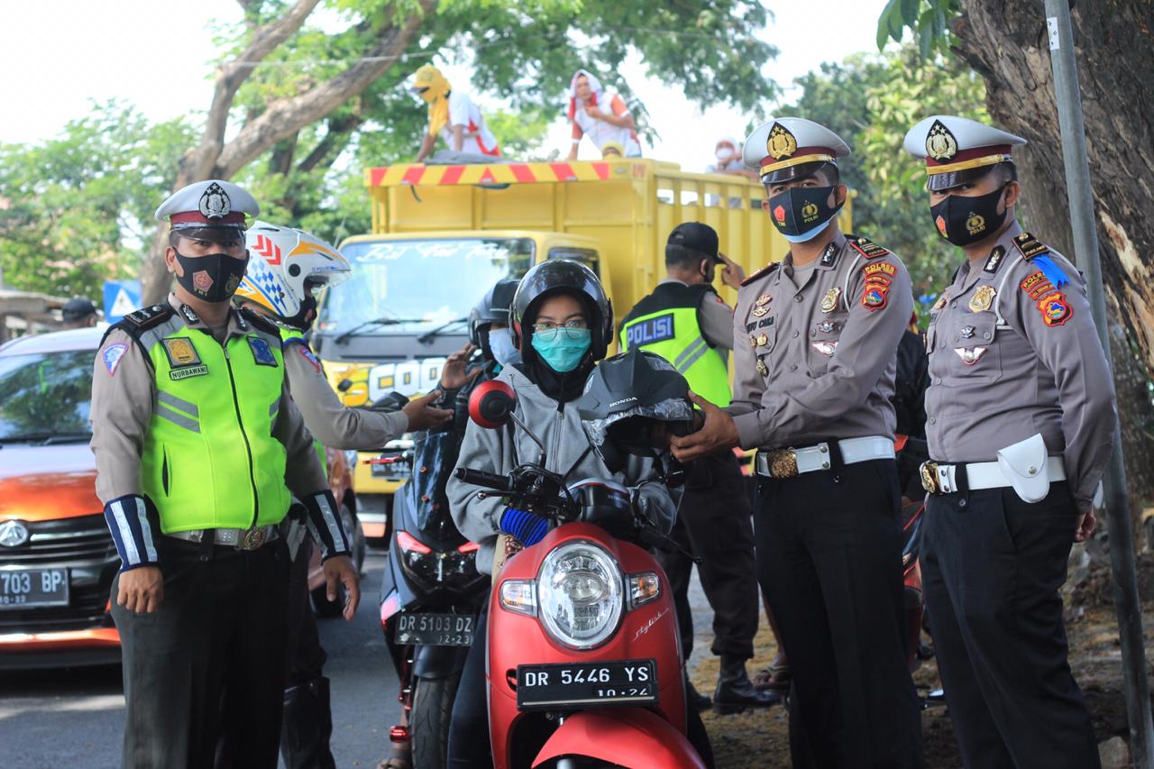 Bila pengendara tertib dan melengkapi surat-surat kendaraan disamping tetap memperhatikan protokol kesehatan (prokes), memperoleh hadiah menarik dari petugas Satlantas. Hadiahnya berupa helm SNI dan kelengkapan prokes lainnya seperti masker.