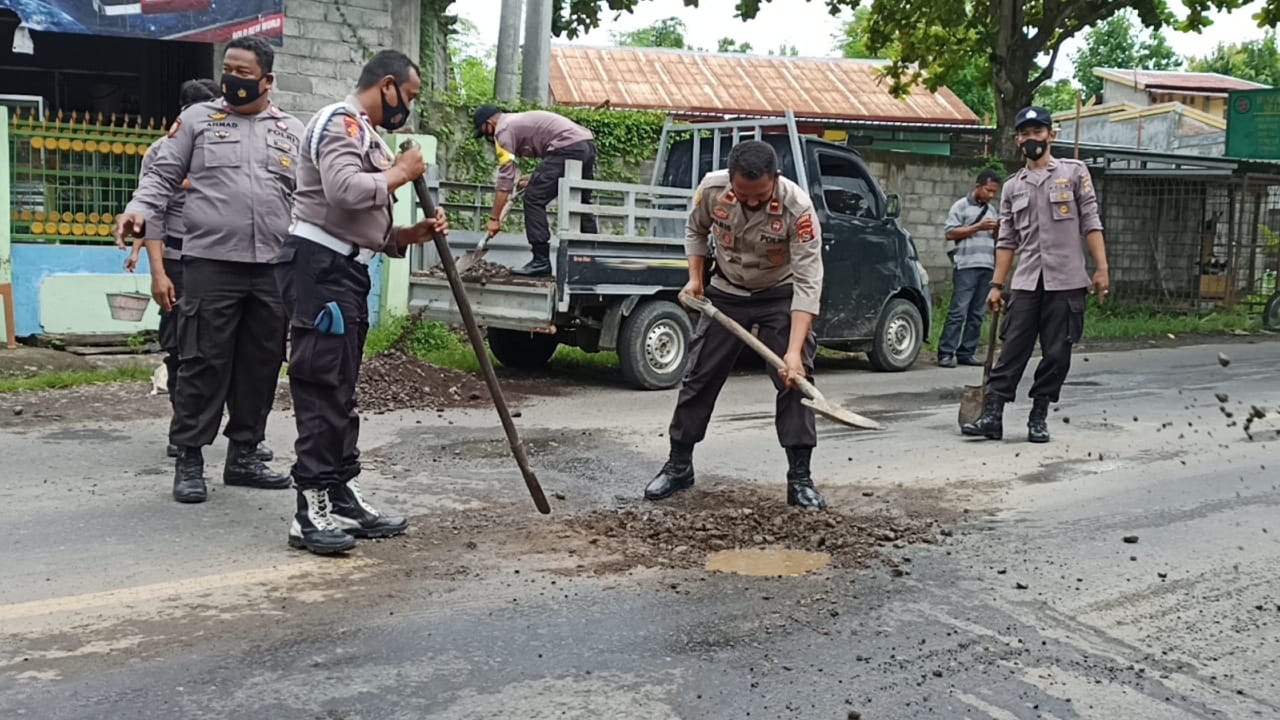 Dompu– Untuk mengantisipasi terjadinya kecelakaan lalu lintas yang disebabkan oleh kondisi jalan yang rusak, Kepolisian Sektor Woja melaksanakan kegiatan Kerja Bhakti secara swadaya memperbaiki jalan berlubang yang berada di badan Jalan Lintas Bima, tepatnya di sepanjang Jalan H. Abubakar Ahmad Kecamatan Woja, Kabupaten Dompu, Provinsi NTB, pada hari Kamis, tanggal 28 Januari 2021, sekira pukul 10.00 wita.