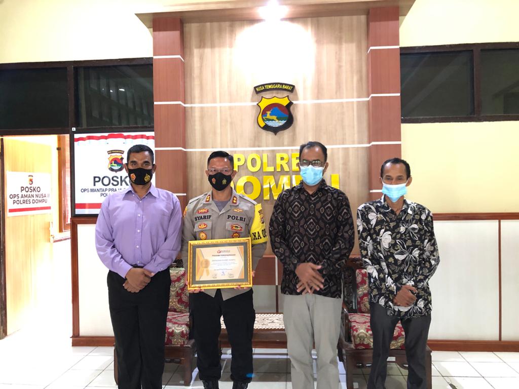 Penyerahan penghargaan ini diserahkan langsung oleh Ketua Bawaslu Dompu Drs. Irwan didampingi jajaranya anggotanya, kepada Kapolres Dompu AKBP Syarif Hidayat SH S.I.K, yang saat itu juga didampingi Kasat Intelkam polres Dompi Iptu Makrus S di Mapolres Dompu.