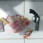 Inilah barang bukti berupa uang dan satu pucuk pistol mainan yang digunakan untuk melancarkan aksi pelaku. DOMPU – Bermodalkan pistol mainan
